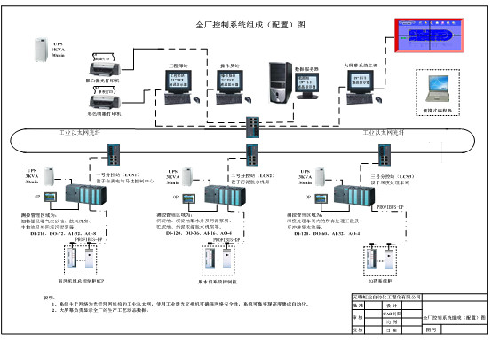 廠區(qū)中控室是整個人機信息交換中心,由2臺互為熱備數(shù)據(jù)服務器,客戶端操作計算機、DLP投影系統(tǒng)、打印機及UPS等構成。主要把過程量信息集中化,把各個現(xiàn)場配置的測控站的數(shù)據(jù)進行收集,并經(jīng)過簡單的操作完成過程顯示,各種圖形的展示,各種趨勢曲線的顯示和控制系統(tǒng)的生成等工作。自動化控制系統(tǒng)設計遵從“集中管理,分散控制”的理念,由中央監(jiān)控系統(tǒng)(上位機/服務器)、現(xiàn)場設備控制站(PLC)網(wǎng)絡構建,各層間具有相對獨立性,并通過千兆光纖工業(yè)以太網(wǎng)進行數(shù)據(jù)交換。 廠區(qū)現(xiàn)場控制站(PLC)直接與各種傳感器,變送器和設備的電氣回路參數(shù)相聯(lián),負責轄區(qū)內(nèi)設備的控制、數(shù)據(jù)采集及PLC從站進行通訊,F(xiàn)場的各種檢測儀表將各種水質參數(shù)和物理量參數(shù)傳遞給現(xiàn)場控制單元,經(jīng)現(xiàn)場控制單元內(nèi)置程序計算后,控制相應設備動作,同時現(xiàn)場PLC單元將檢測量和控制量通過通訊系統(tǒng)傳給調(diào)度主機,確保出水水質指標。對于異常工藝參數(shù),通過網(wǎng)絡及時向中控室發(fā)出報警信號,并根據(jù)中控室的指令進行應急處理。 主要工藝設備的控制均具有自動、機旁手動、人機界面手動功能,充分考慮維修和維護的方便,讓工藝設備能平穩(wěn)地從工藝運行中切入和切出?刂瞥绦蚓哂袊栏竦陌踩(lián)鎖,互鎖,確保設備生產(chǎn)安全運行。 3.工藝流程圖及系統(tǒng)實現(xiàn)功能
